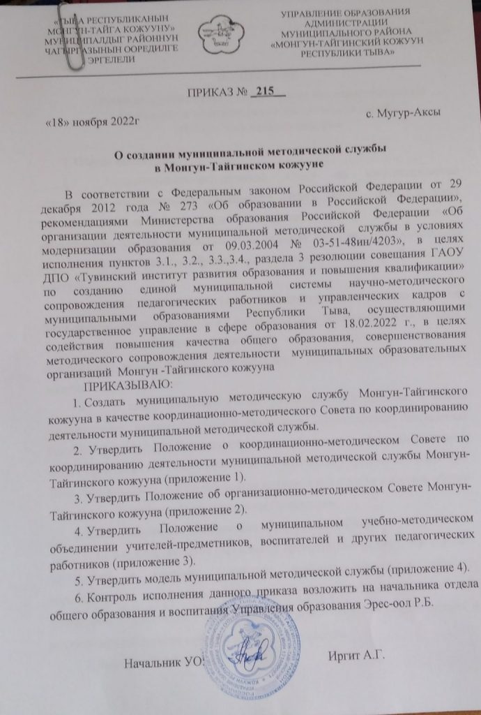 НПА Федерального уровня 1.-ФП-Современная-школа-07.12.2018Скачать 2.-Ст.-19-ФЗ-273-от-29.12.2012Скачать 3.-Распоряжение-ПРФ-от-31.12.2019Скачать 4.-Указ-ПРФ-474-от-21.07.2020Скачать 6.-Методические-рекомендации-РСНМС-от-30.04.2021Скачать Регионального уровня 1.-prikaz_minobra_no162-d_utv.koncepciiСкачать 2.-prikaz_minobra_no165-d_reg.metodsluzhbaСкачать 3.-Prikaz_MO_RT_454-____Скачать 4.-prikaz_mo_rt_no461-d_ot_17.05.22_o_poryadke_formirov.region.reestra_upravl.praktikСкачать Муниципального уровня Приказ-№-215-О-создании-ММССкачать О-создании-муниципальной-методической-службы-в-Монгун-Тайгинском-кожуунеСкачать О-назначении-руководителей-муниципальных-учебно-методических-объединений-учителей-Монгун-Тайгинского-кожууна-на-2022-2023-уч.-годСкачать Положения о ММС 115Скачать План-работы-ММсСкачать О-развитии-ШУМО-и-МУМОСкачать Пргограмма-развития-педагоговСкачать Мониторинг-методической-работы-ООСкачать План-поддержки-молодых-педагоговСкачать О-мониторинге-адаптации-молодых-педагоговСкачать О-формировании-муниц-реестра-лучших-практикСкачать