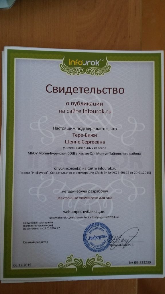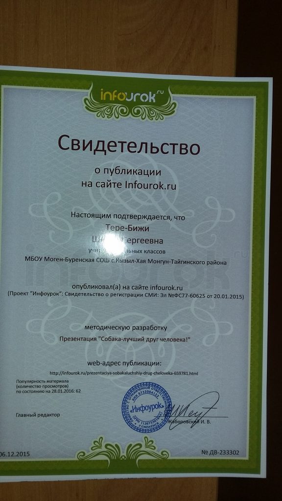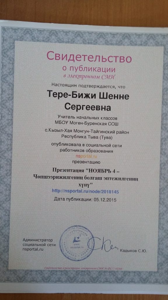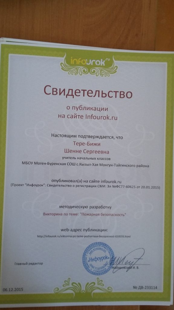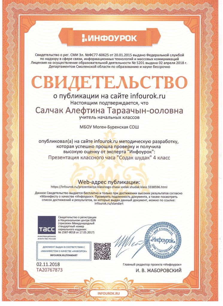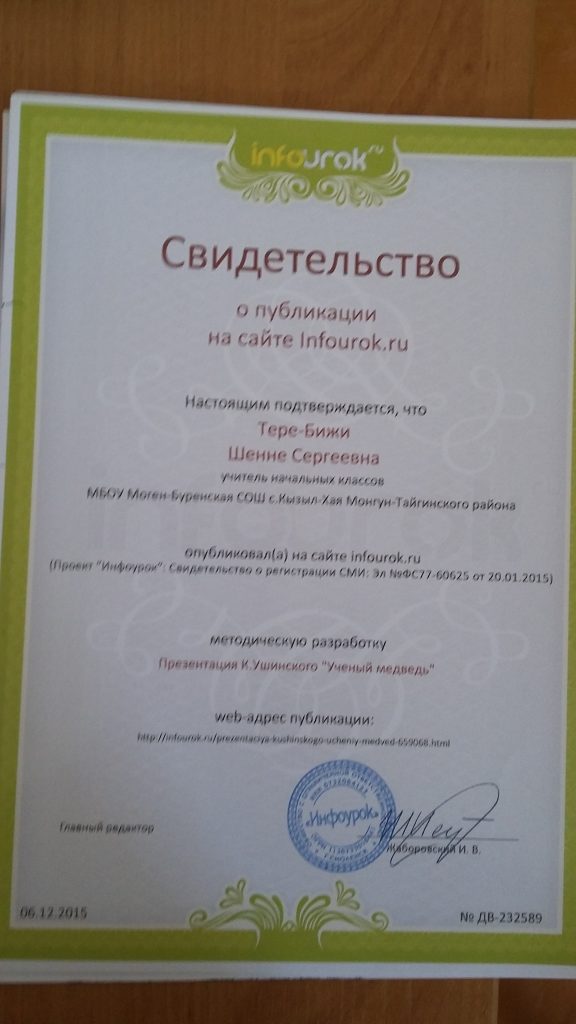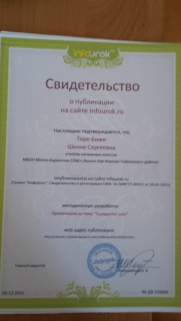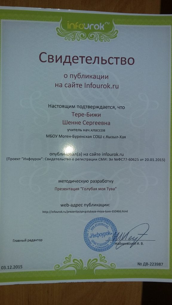 «Тыва улустуӊ отка хамаарышкан ужурлары», 2019 г. Сайт «Инфоурок», https://infourok.ru